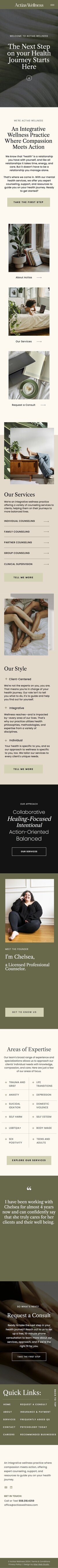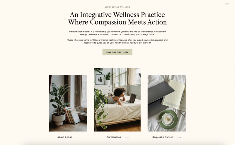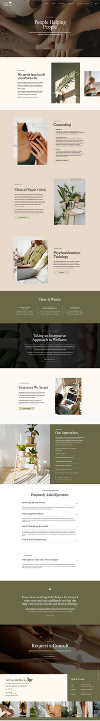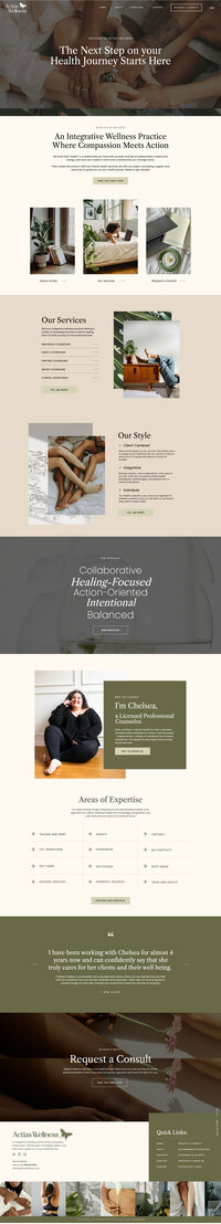 Keeping Chelsea, her clients, and her goals for her practice in mind, I built the Actias Wellness brand and website, characterized by a welcoming, conversational tone, creative calls to action, and growth-oriented imagery.